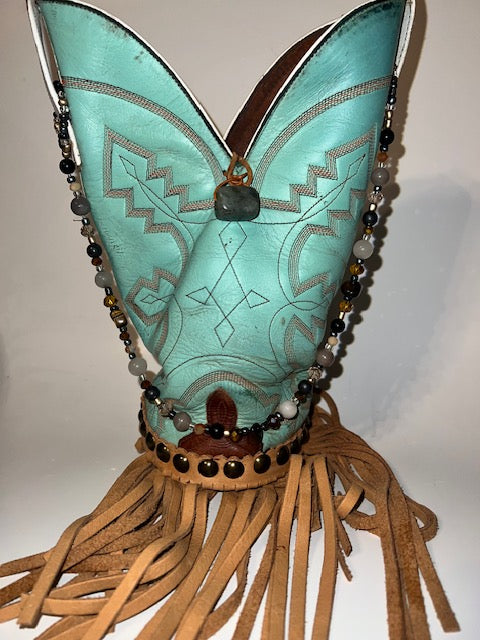 Turquoise Boot purse with tan fringe, beaded crystal strap and closure