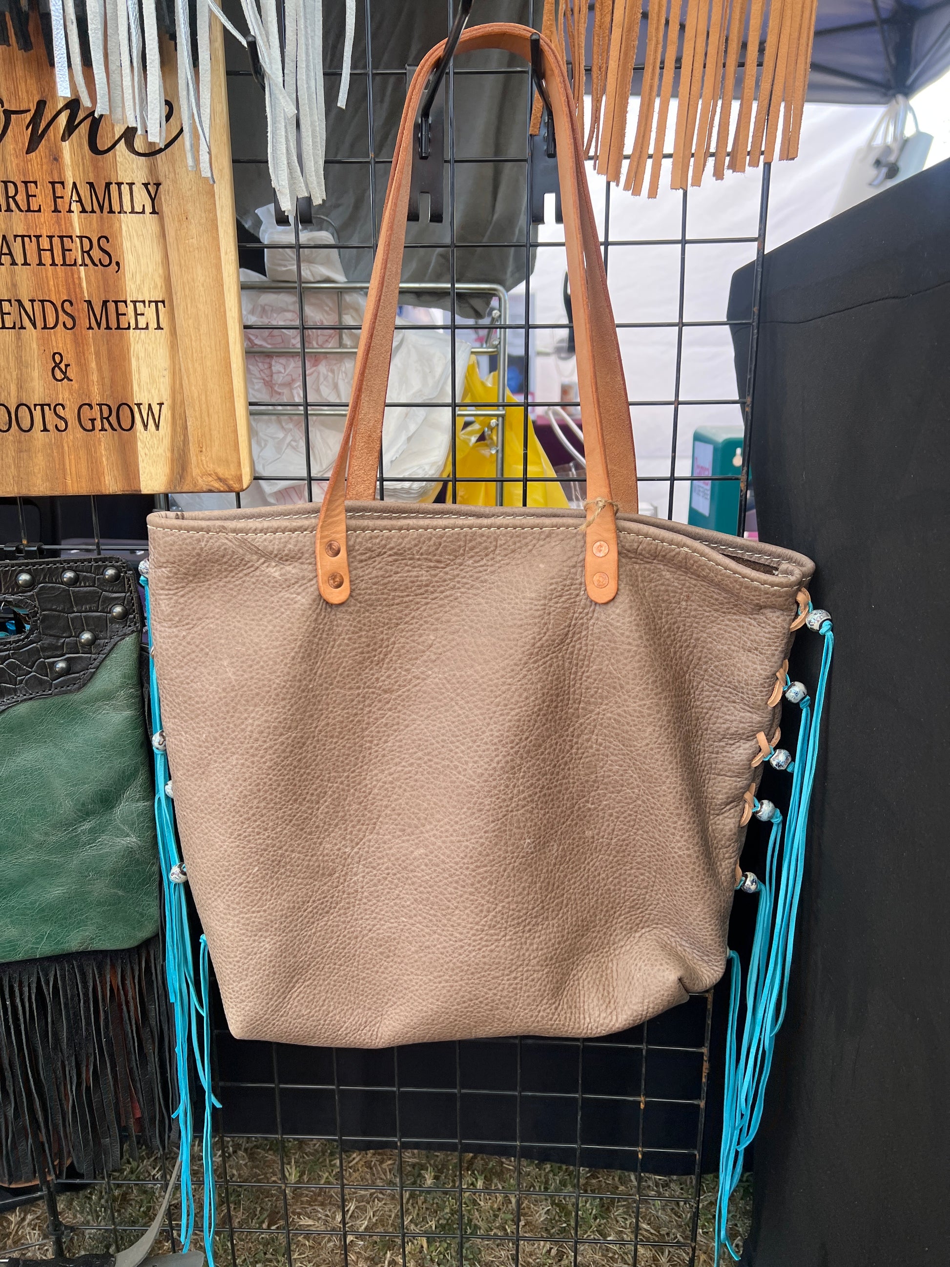 Large brown leather tote bag with front and inside pockets, live oak leather straps, and detailed leather stitching. Accented with turquoise leather strips and beaded sides for that perfect touch of Western charm. Functional, stylish, and full of character — your new go-to everyday bag.