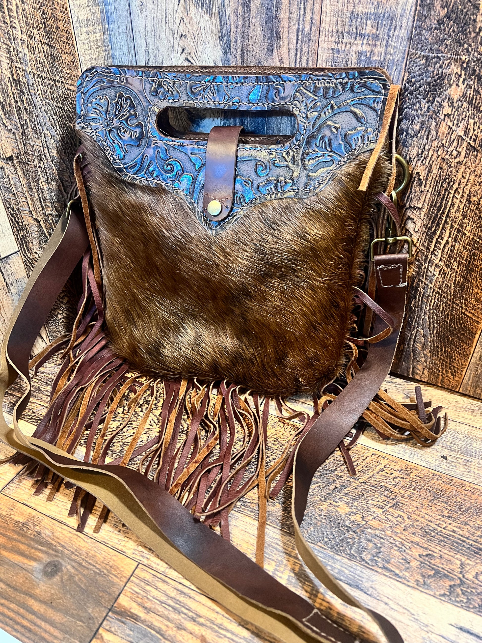 Stand out with our leather + hair-on-hide crossbody handbag. Designed with a sturdy leather strap, playful fringe detail, and a secure snap closure, this bag is equal parts rustic charm and modern convenience.