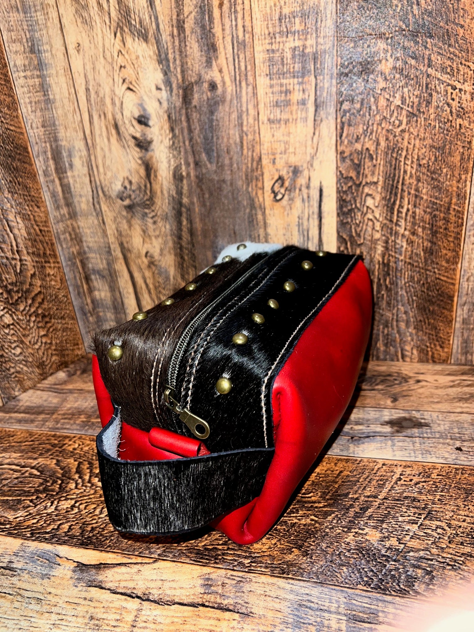 Red Leather Toiletry bag with hair-on-hide trim and antique gold round leather spots for accent